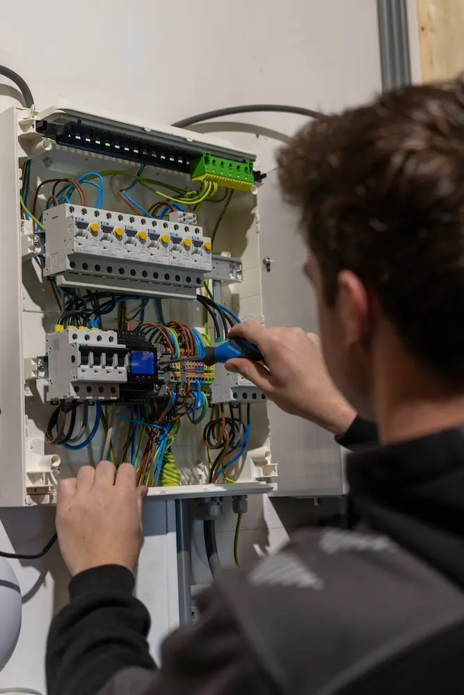 Installateur van EcoTech werkt aan omvormers en elektrotechnische installatie